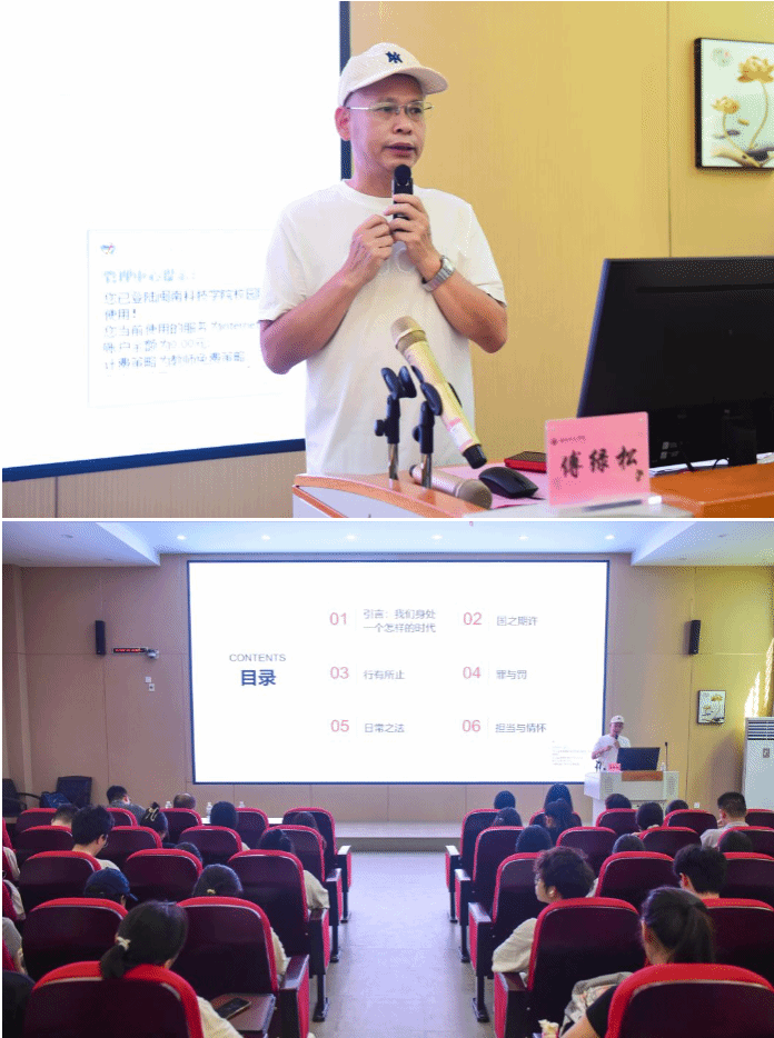 主讲人傅绿松律师以“时代使命与法律底线——当代大学生的行为规范”为主题,紧扣大学生群体特质,从“立大志、明大德”的时代要求切入,通过“引言:我们身处一个怎样的时代”开篇,层层展开“国之期许、行有所止、罪与罚、日常之法、担当与情怀”六大核心板块。讲座创新采用“法律条文+现实案例”双轨解读模式,重点剖析《治安管理处罚法》中与校园生活紧密相关的条款,针对网络造谣、公共场所滋事等常见违法情形进行释法说理,通过“以案释法”增强了学生的法治思维与风险识别能力。